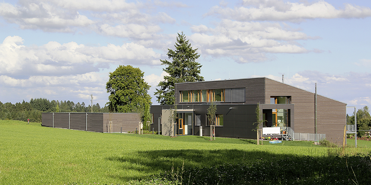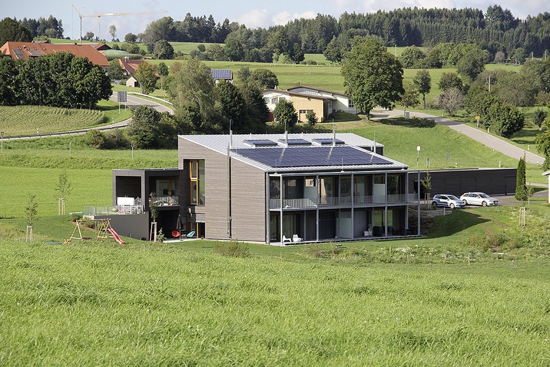 Das Gebäude ist hochwärmegedämmt und mit einer hinterlüfteten Fassade versehen, verkleidet mit Faserzementplatten bzw. einer waagrechten Holzschalung. Das Haus ist mit äußerst nachhaltiger Gebäudetechnik ausgestattet: Die Erdwärmepumpe, gespeißt durch geothermische Energie, versorgt die Wohnungen mit Wärme und Warmwasser und ermöglicht die Kühlung des Hauses. Die kontrollierte Be- und Entlüftungsanlage mit Wärmerückgewinnung ergänzt die Gebäudetechnik; die Photovoltaikanlage auf dem Dach dient zur Stromgewinnung.