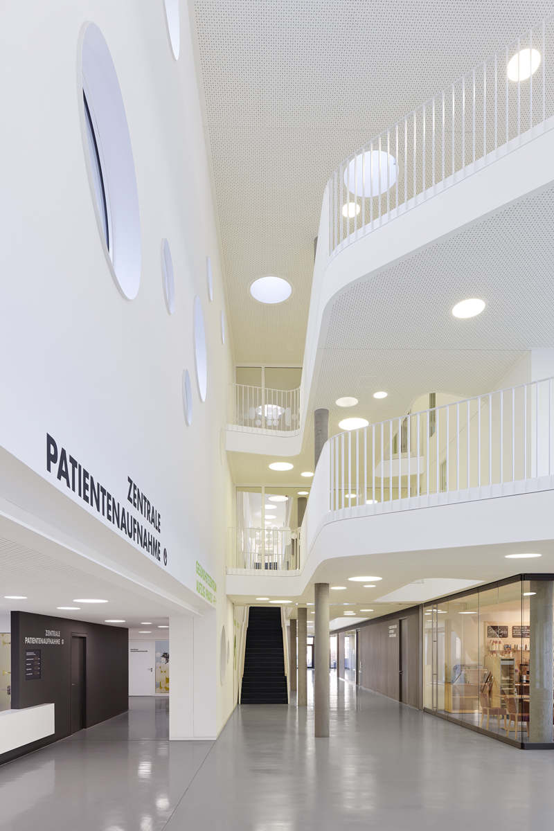 Über den Eingangsplatz erreichen die Besucher und Patienten das Foyer. Der zentrale Empfang übernimmt die Verteilung der Personenströme in das Klinikum, das Ärztehaus und die zentrale Patientenaufnahme. Eine klar strukturierte Erschließung und grüne Innenhöfe ermöglichen eine leichte Orientierung im Haus und eine Trennung der Besucher– und Patientenbereiche. Die sorgfältige Zuordnung der Funktionsstellen untereinander unterstützt die klinischen Abläufe und erhöht durch kurze Wege- und Wartezeiten die Patientenzufriedenheit.
