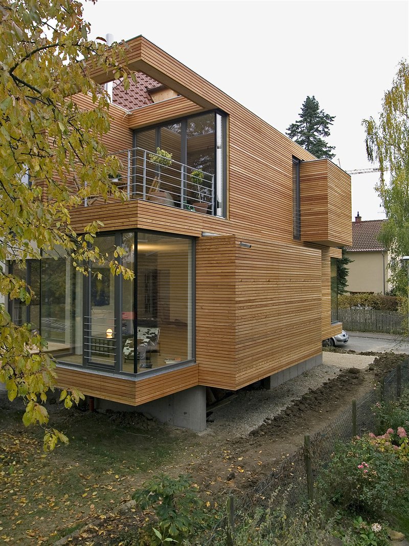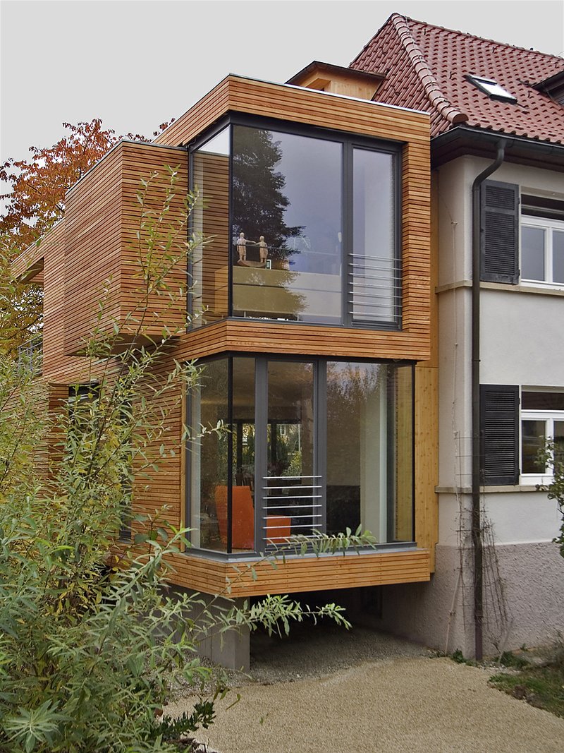 In einer weitläufigen Siedlung aus den 1930er Jahren im Süden Stuttgarts gelegen wurde eine Erweiterung für ein bestehendes Wohnhaus geplant. Der sorgfältig gefügte Neubau präsentiert sich nach außen als klar geschnittene Kubatur in Form einer hölzernen Box. Sein Volumen passt sich in Maßstäblichkeit und Form der Typologie der umgebenen Dreißiger-Jahre-Bauten an. Mit einer scharfen Fuge vom Altbau getrennt verschmelzen Anbau und Bestand zu einem neuen, einheitlichen Ganzen.
