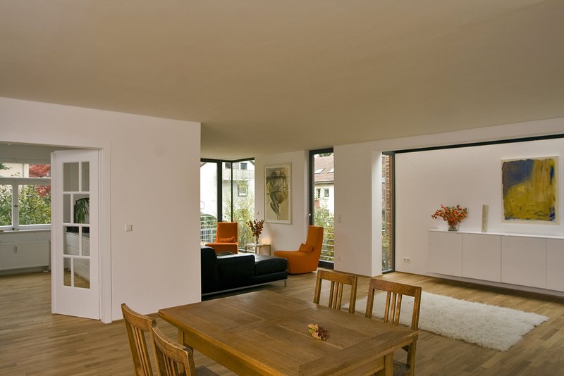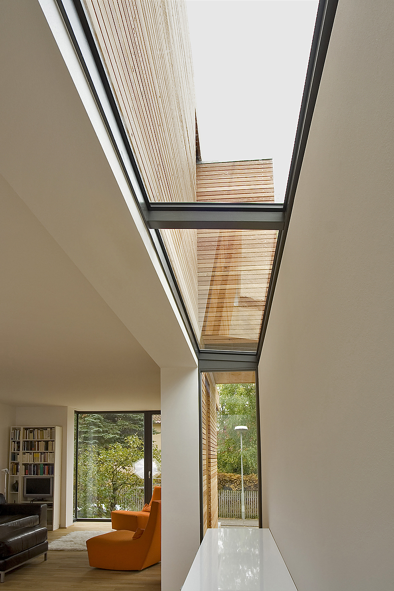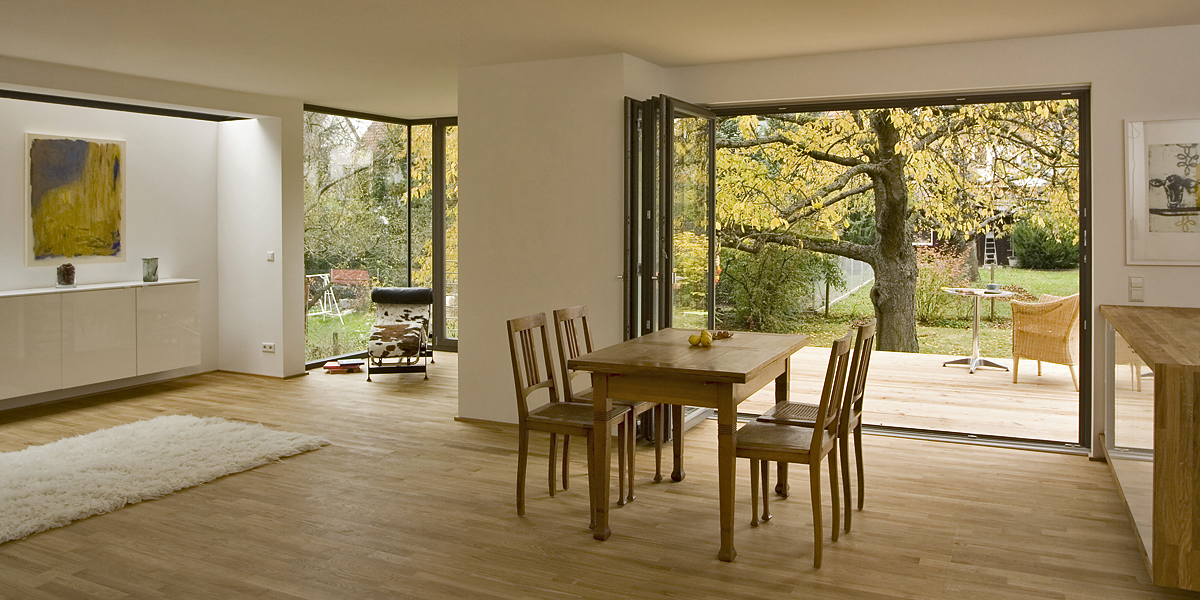 Dagegen erhalten die kleinteiligen introvertierten Individualräume im Innern des Altbaus (Schlaf-, Kinder- und Arbeitszimmer) mit der räumlich großzügigen Erweiterung ein neues Zentrum. Mit raumhohen Fenstern verglast entsteht eine weitläufige helle Wohnlandschaft. Differenzierte Ausblicke und Öffnungen in der Außenwand und ein lang gezogenes Oberlicht gliedern den weitläufigen Raum in einzelne, miteinander verschmelzende Orte, ein Raum Kontinuum. Einen großzügigen Essbereich mit offener Küche, eine Leseecke, ein Raum für die Kinder, der Ausgang auf die hölzerne Terrasse, ein offenes Wohnzimmer im Freien unter der Krone eines alten Kirschbaums.