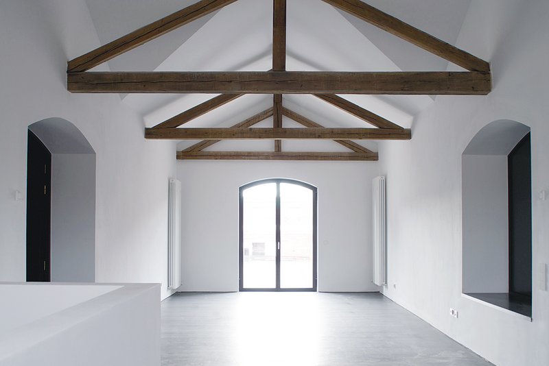 Für die erforderliche Belichtung der historischen Stallräume wurden neue Fenster in die Fassade geschnitten. Die neuen Öffnungen sind unterhalb der Rundbogenfenster platziert. In der Außenbetrachtung sind pro Fassadensegment zwei voneinander getrennte Fenster erkennbar. Von innen ist zu sehen, dass es sich bei den Fenstern jeweils um ein großes Fensterelement handelt, das sich innen in der Maßstäblichkeit dem hohen Stallraum anpasst.
