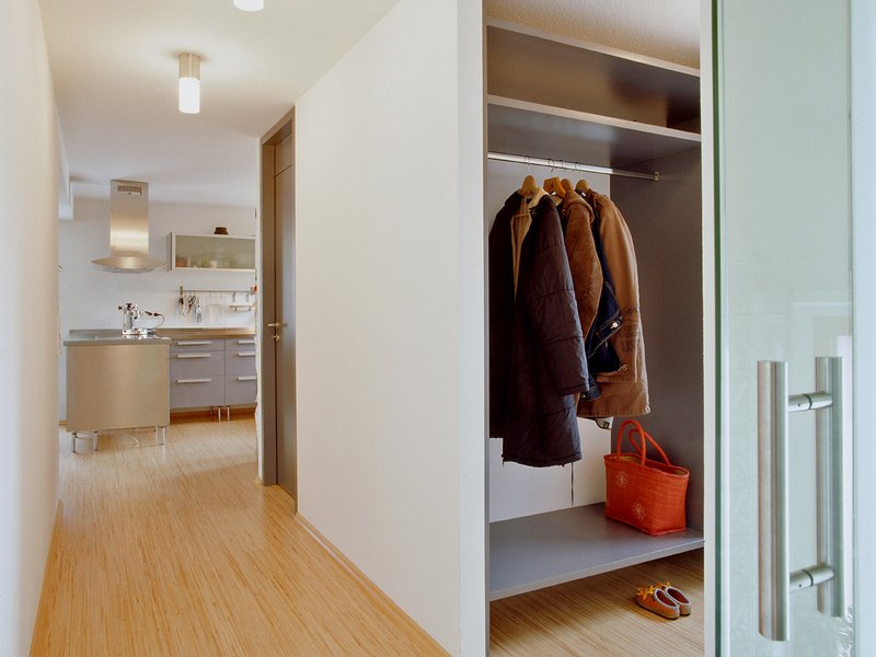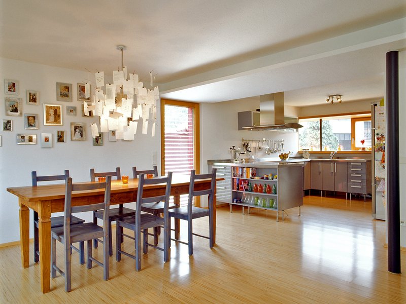 Durch das Einziehen von Stahlträgern kann auf tragende Wände verzichtet werden. Es entsteht ein freier Erd- und Untergeschossgrundriss. Küche, Flur, Wohn- und Essbereich fließen räumlich ineinander. Diese neue Struktur ist durch die geplanten Eckfenster an der Fassade ablesbar. Sie rahmen den Blick auf das Weinbergpanorama. Aus dem überflüssig gewordenen Abstellraum und dem Öllager im Untergeschoss entsteht ein Atelier mit einem 4,50 Meter breiten Fenster und angrenzender Terrasse. Als Ergänzung zum großzügigen Erd- und Untergeschoss befinden sich im Obergeschoss die dienenden und privaten Räume. Eltern- und Kinderzimmer mit den zugeordneten Bädern flankieren einen breiten und gut belichteten Flur. Der ausgebaute Dachboden ist die vertikale Erweiterung eines Kinderzimmers.