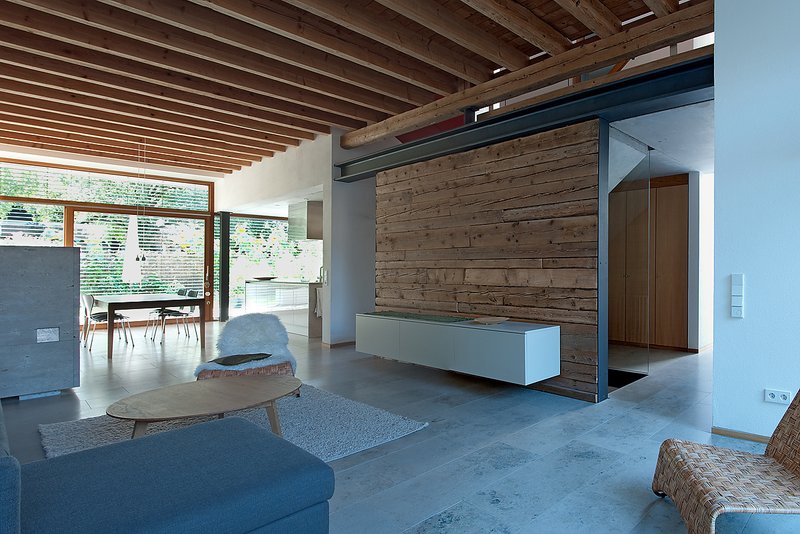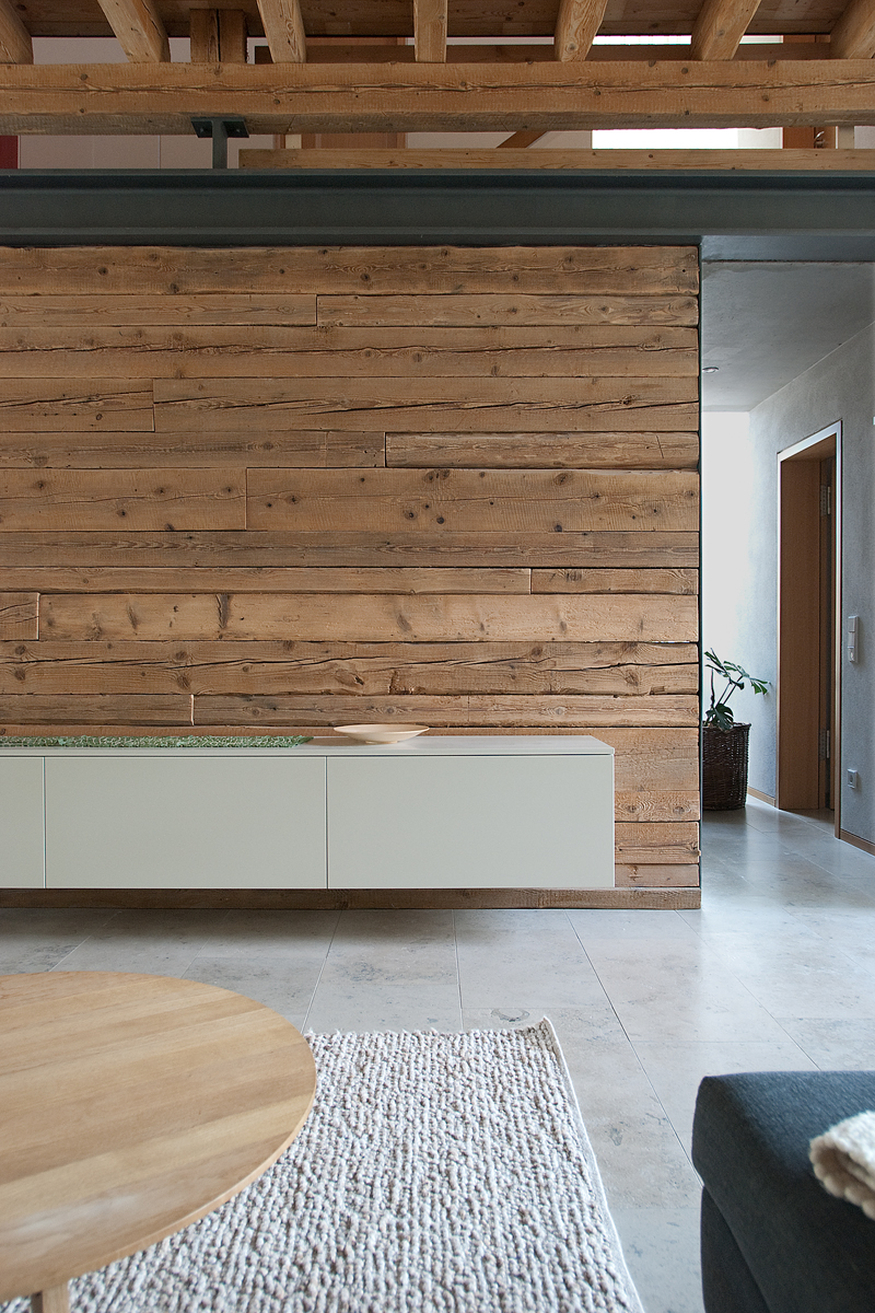 In der Scheunendurchfahrt entsteht ein überhoher, über die ganze Gebäudetiefe durchbindender Wohn- und Essbereich, stirnseitig belichtet über großflächige Verglasungen. Im Bereich ehemaliger Pferdeboxen liegen Eingang, Garderobe und offene Küche. Auf den wechselnden Niveaus der früheren Tennen finden sich die Ruhe- und Arbeitszimmer und das Reich der Kinder. Offene Luft- und Zwischenräume erlauben vielfältige Blickbeziehungen zwischen den Ebenen.