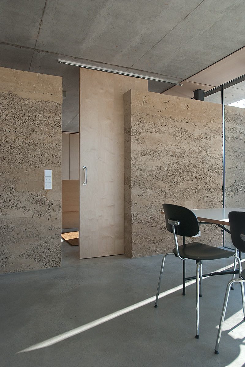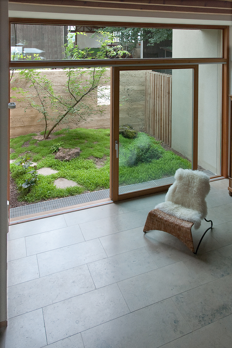 Durch einen erdgeschossigen "Durchschub" des Grundrisses setzt sich der Bau an entscheidenden Stellen von der bisherigen Kubatur der Scheune ab. Westseitig zu Garten und Straßenraum bildet sich ein markanter Vorbau, der die neue Nutzung nach außen kenntlich macht. Ostseitig entsteht durch die Einziehung und geschützt durch eine schwere Wandscheibe in gefärbtem Schüttbeton ein kleiner Innenhof. Gewählt bepflanzt ist er intimer Außenraum und "grünes Zimmer" des Wohnbereiches.