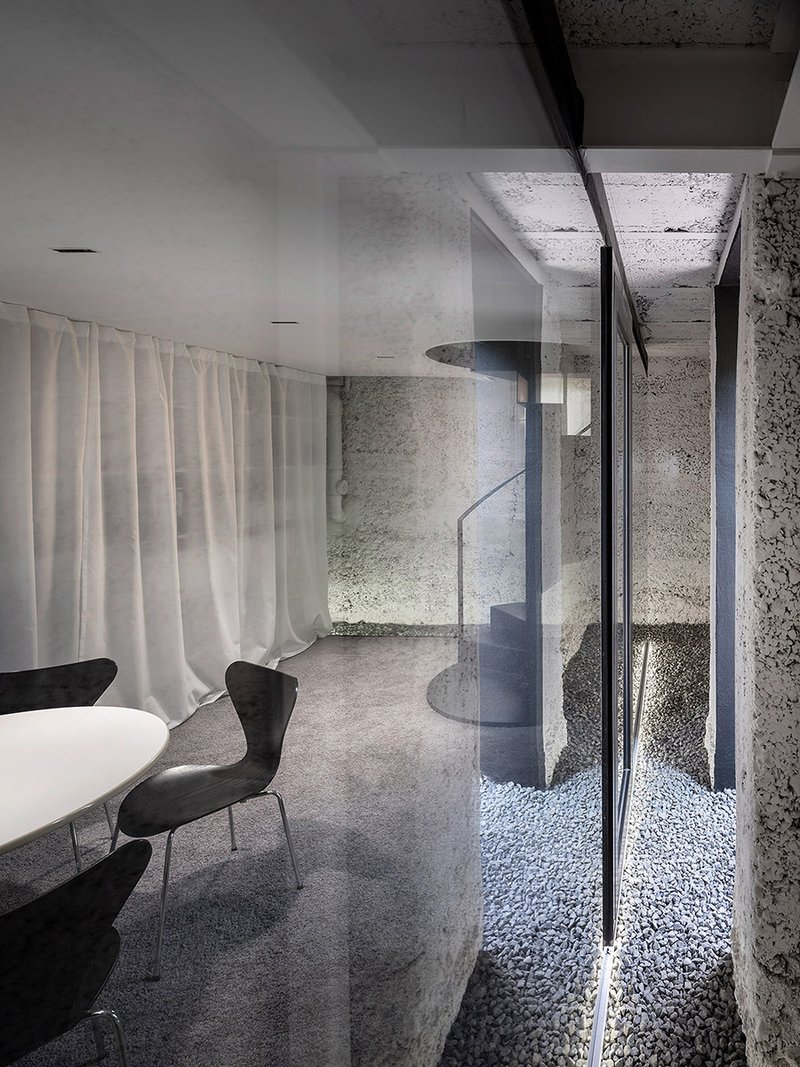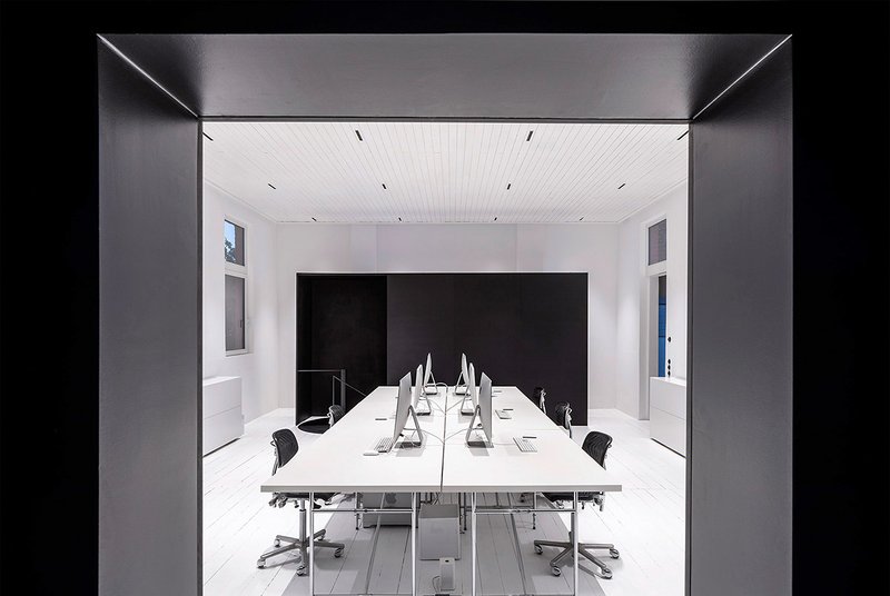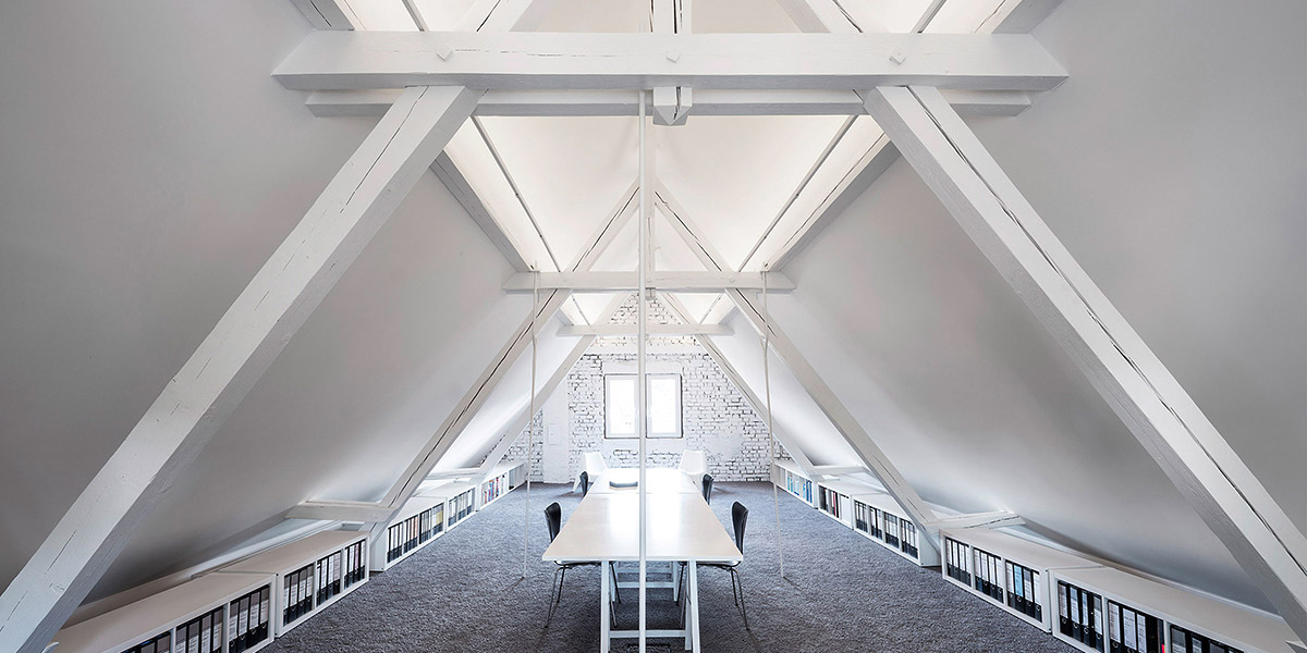 Das Dachgeschoss ist innenseitig gedämmt und dient mit seiner großen zentralen Tischfläche als Archiv/Rückzugsmöglichkeit. Eine neue schmale Wendeltreppe Verbindet den Hauptraum mit dem zuvor ungenutzten Keller, wo sich nun ein zusätzliches Besprechungszimmer mit direktem Zugang zum Garten befindet.