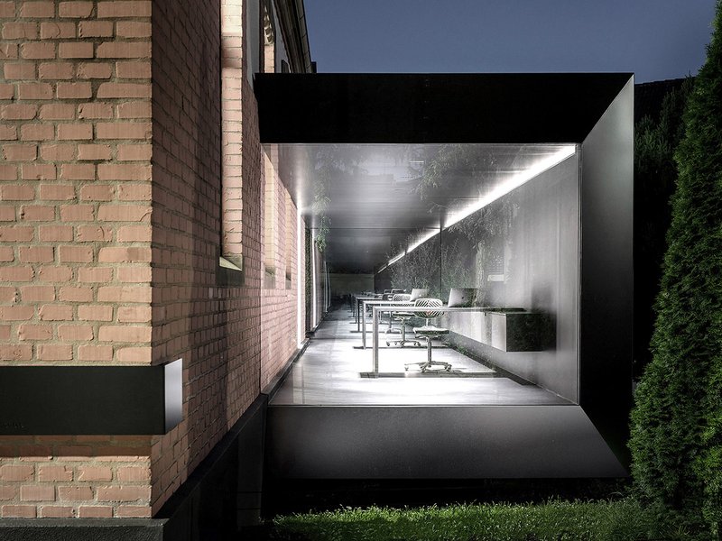 Die großen Verglasungen des freischwebenden Anbaus geben den Blick frei auf die unveränderte historische Außenfassade sowie Nachbarschaft und Garten. Befreit von einem Zuviel an Materialien, Einbauten und Formen kommt das historische Gebäude zur Ruhe.