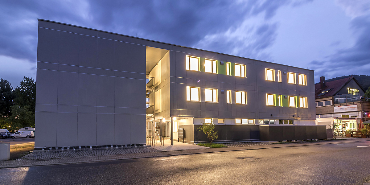 Die Kombination der Holzmodule führte zu einer übersichtlichen Bauform um einen dreiseitig geschlossenen Innenhof. Auf der Hofseite befindet sich auch die innere, U-förmige Laubengangerschließung. Durch die gewählte Baukörperausformung übernimmt die Gesamtanlage gleichzeitig die städtebaulichen Koordinaten des Ortes.