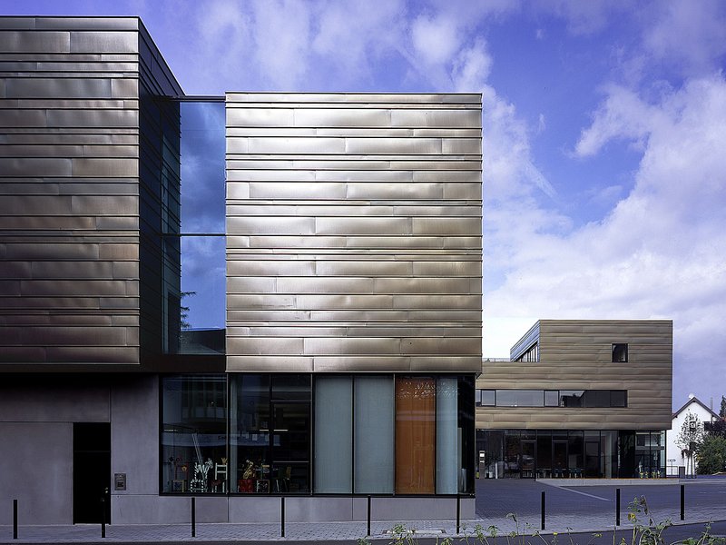 Die gedämmte, hinterlüftete Metallfassade besteht aus eloxierten, 3 mm starken Edelstahlpaneelen, die zunächst geprägt und dann nochmals überschliffen wurden. Das Polyspektralverfahren der Eloxierung verleiht dem Material einen kupferfarbenen Glanz, der sich je nach Lichteinfall von einem dunklen Bronzeton bis zu einem strahlenden Messington verändert. Die überschliffene Prägung unterstützt dabei den irisierenden Effekt.