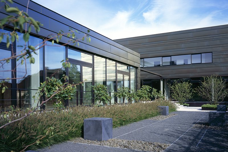 Die Fassade wurde in einer klassischen Stehfalzbildung ausgeführt, wobei sowohl die Paneellängen als auch die Höhen gemäß der vorhandenen Fensterteilung variieren. Wichtig bei Planung und Ausführung war, dass die Stehfälze auf der gesamten Fassade gleichmäßig durchlaufen. Die Fassade unterstützt somit den Entwurfsgedanken. Material und Farbwahl integrieren das Gebäude ins städtische Gesamtbild und heben es gleichzeitig als markanten Stadtbaustein hervor.