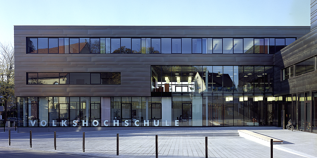Der Neubau der Volkshochschule bildet den markanten Eckpunkt des Kulturforums über die Stadthalle „Ballei“ bis zur Städtischen Musikschule. Während die Musikschule sich auf einer Freitreppe zur Stadt hin öffnet, empfängt die Volkshochschule am anderen Ende des Kulturforums den Besucher auf einem kleinen Platz, der die historische Frauenkirche als stadtbildprägendes Gebäude heraushebt und einen angemessenen Vorbereich für den Neubau darstellt. Ein markanter zweigeschossiger Kubus kragt über das Sockelgeschoss und wird somit baukörperlich bis zum Deutschordensplatz präsent. Der Lebensmittelmarkt liegt an der Südseite des Grundstücks mit Bezug zur Stadtmitte und dahinter liegendem Parkhaus. Dessen Geschossversatz nimmt die vorhandene Topographie auf und schließt das Ensemble an der Westseite gegen die Bahngleise ab.