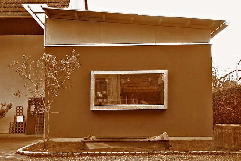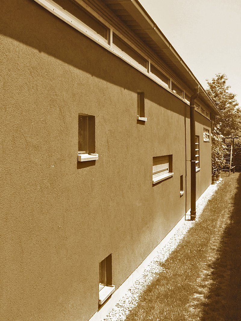 In Folge der schmalen Grundstücksituation, wurde das geforderte Raumprogramm in einem länglichen Baukörper hintereinander liegend untergebracht. Hierdurch war es möglich, den Bau werbewirksam zur Straße hin zu orientieren, und gleichzeitig den Anschluss an das Bestandsgebäude im Bereich der Flurzone zu ermöglichen. Resultierend aus der Lage des Gebäudes ergibt sich eine zum Garten orientierte Laube sowie eine Begrenzung des Betriebshofes zur Nachbarschaft.