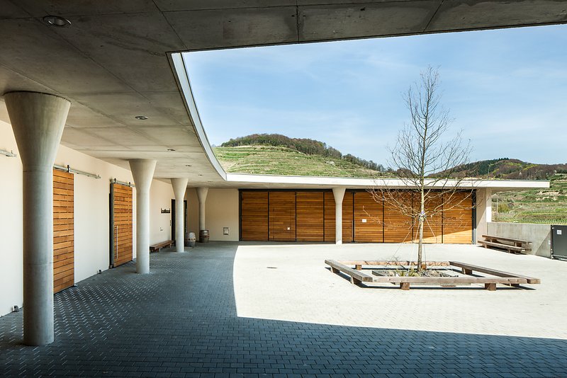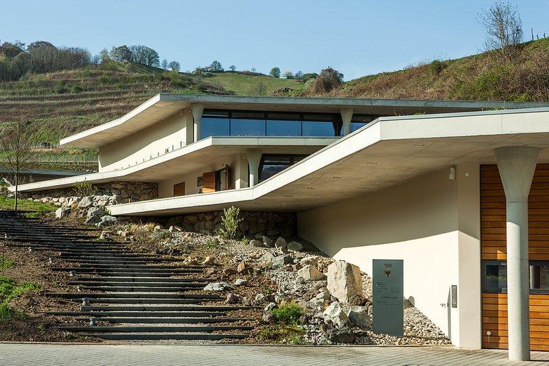 Im Einklang mit den Terrassen des Kaiserstuhls verbindet sich das Gebäude mit der Landschaft. Mit dem Konzept der drei Ebenen, welche gegeneinander versetzt sind, scheint das Gebäude mit der Umgebung zu verschmelzen und greift so gleichzeitig die für den Kaiserstuhl typische und prägende Terrassenlandschaft auf. Der harmonische Übergang von Natur und Gebäude besticht durch seine Selbstverständlichkeit. Sämtliche Dachflächen sind mit einem Wiesensaatgut vom benachbarten Badberg begrünt, welches eigens aus dem Naturschutzgebiet gewonnen wurde. So eingepasst in die einzigartige Kulturlandschaft bietet das Weingut gleichzeitig interessante Einblicke in die Produktionsabläufe und einen einzigartigen Panoramablick von der Terrasse des Weingutrestaurants "Kellerwirtschaft" - Kaiserstuhl zum Anfassen.