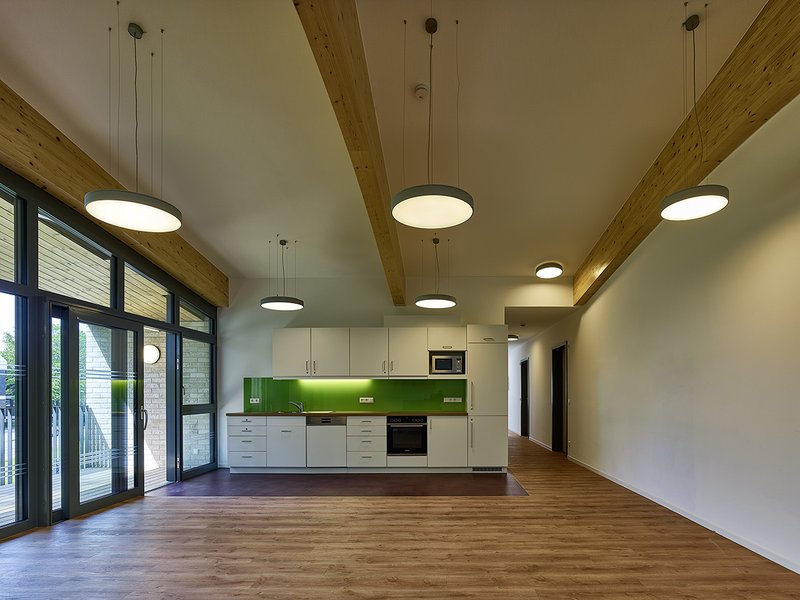 In jeder Wohnung finden sechs Bewohner ein eigenes Zimmer sowie Bad vor. Das Herzstück jeder Wohnung bildet ein großer nach Süden orientierter Gemeinschaftsbereich zum Kochen, Essen und Wohnen. Die hier platzierte offene Küche lädt zum gemeinsamen Kochen ein und stärkt das Miteinander der Bewohner. Von dem gemütlichen, hellen Wohnbereich haben sie über große Glasflächen einen direkten und freien Ausblick auf den Garten. Die dazwischen angeordnete Terrasse erweitert den Wohnraum nach draußen. Im Obergeschoss schließen Loggien an den Gemeinschaftsbereich an und bilden diesen geschützten Übergang.