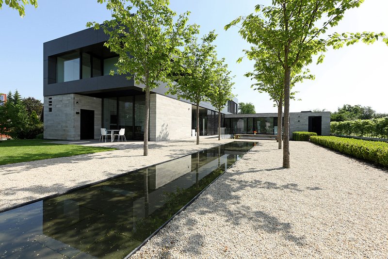 Der im Obergeschoss als Riegel ruhende, dunkel gehaltene Körper definiert den Ortsrand, nimmt sich jedoch durch Farbigkeit und Lage optisch zurück. Die allgemeinen Räume im Erdgeschoss "Wohnen, Essen, Lesen" legen sich in die fließende innen- und außenräumliche Landschaft.