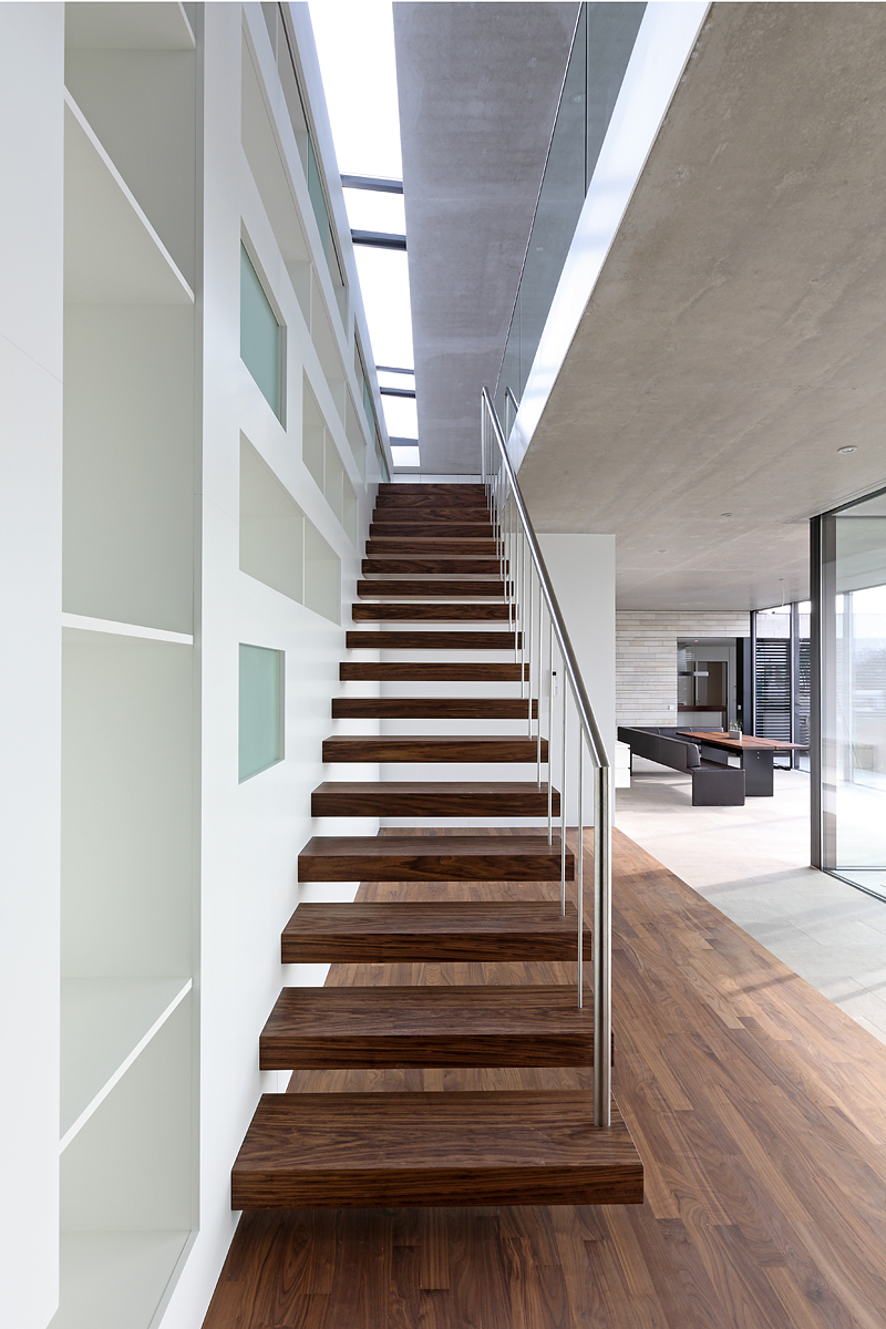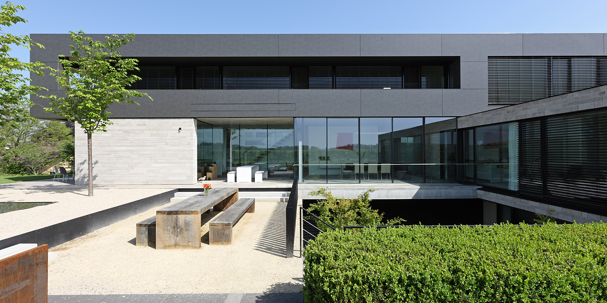 In der Grundkonzeption standen folgerichtig entsprechende Materialien im Vordergrund, welche diese Ursprünglichkeit und "Erdung" aufnehmen und die Qualität des Wohnens bilden: Kalkgestein, naturbelassenes Nussbaumholz, transparentes und opakes Glas.