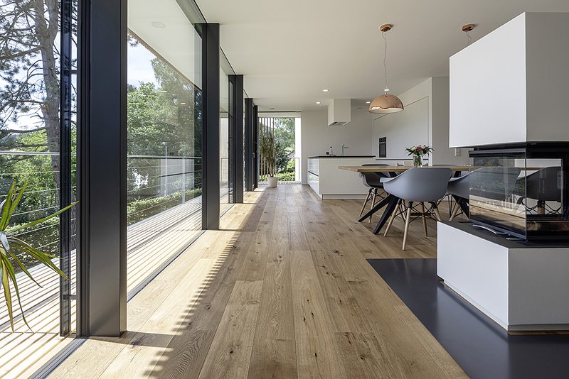 Das Wohnhaus gliedert sich in ein Eingangs- und ein Gartengeschoss. Über die Nordseite erreicht man das Gebäude über die Hofeinfahrt und einen überdachten Eingangsbereich. Im Eingangsgeschoss befindet sich der nach Süden hin ausgerichtete und verglaste Koch-, Wohn und Essbereich. Daran schließt sich eine Terrasse mit umlaufender Loggia an. Weitere Nebenräume sowie die Doppelgarage finden ebenfalls im Eingangsgeschoss ihren Platz. Im Gartengeschoss befinden sich alle privaten Räume der Familie mit direktem Gartenzugang und nach Süden ausgerichtet. Nebenräume, wie ein Hauswirtschaftsraum, Ankleide, Badezimmer und die Haustechnik sind an der Nordseite angesiedelt.