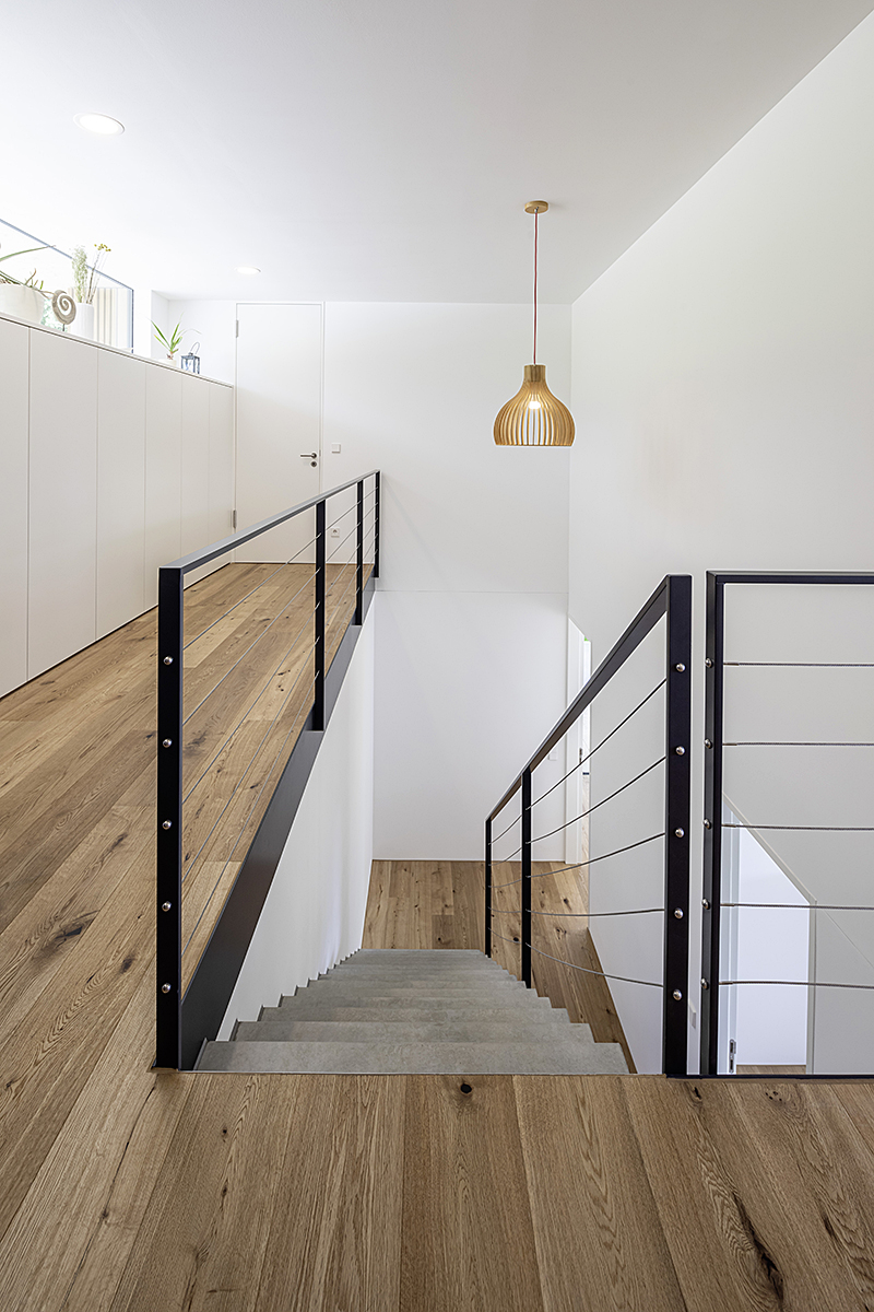 Die reine Wohnfläche des KfW 55 Effizienzhauses beträgt 201,65 m². Errichtet wurde das Eingangsgeschoss des Einfamilienhauses in Holzständerkonstruktion mit Holzfaserdämmung (240 mm) mit zusätzlicher nahtloser Zusatzdämmung aus Holzweichfaserplatten (60 mm). Die Decken wurden als Brettsperrholzdecken ausgeführt. Die Fassade wurde in Weißtanne vorgehängt.