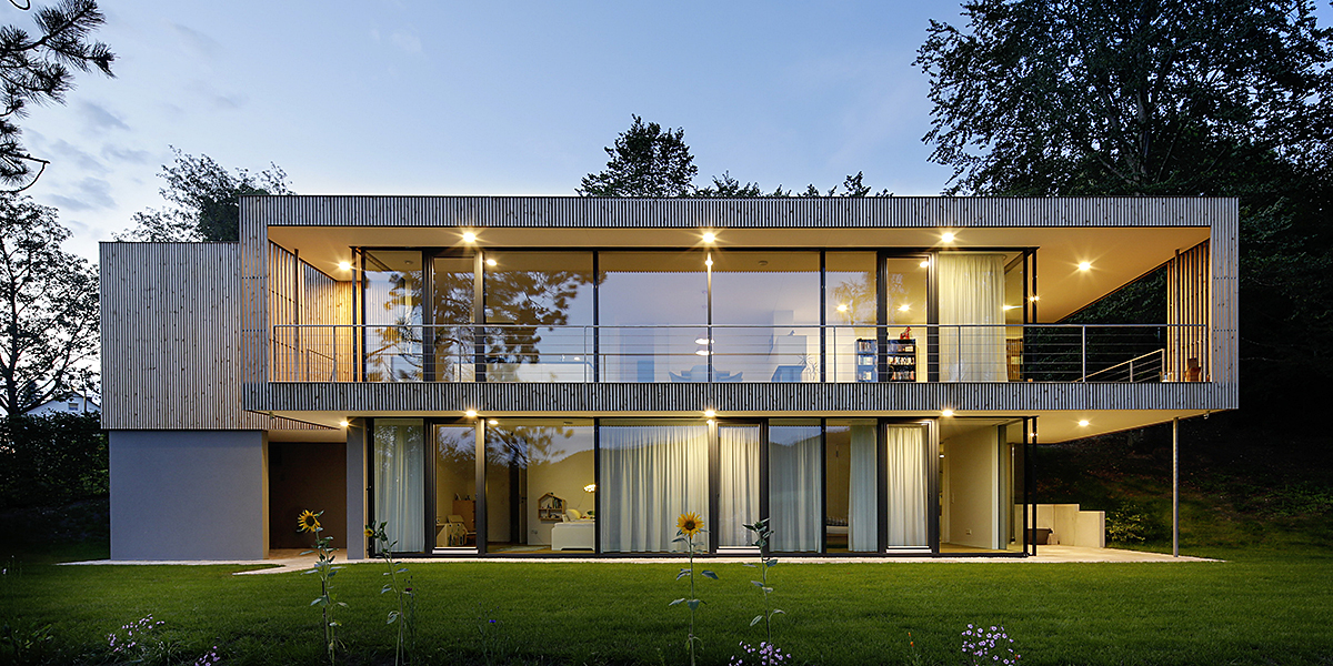 In exponierter Hanglage wurde dieses zweigeschossige Wohnhaus mit Doppelgarage in klassischer Holztafelbauweise über einem massiven Sockel errichtet. Der Bauherr wünschte sich im parkartigen, elterlichen Garten ein Einfamilienhaus mit großer Privatsphäre trotz Aussichtslage. Zudem sollte der Baumbestand weitgehend unberührt bleiben. Ein Bebauungsplan existierte nicht. Von der Gemeinde wurde aber eine grenz- und straßenparallele Bebauung an einer der Grundstückslängsseiten im Norden oder Süden gewünscht.