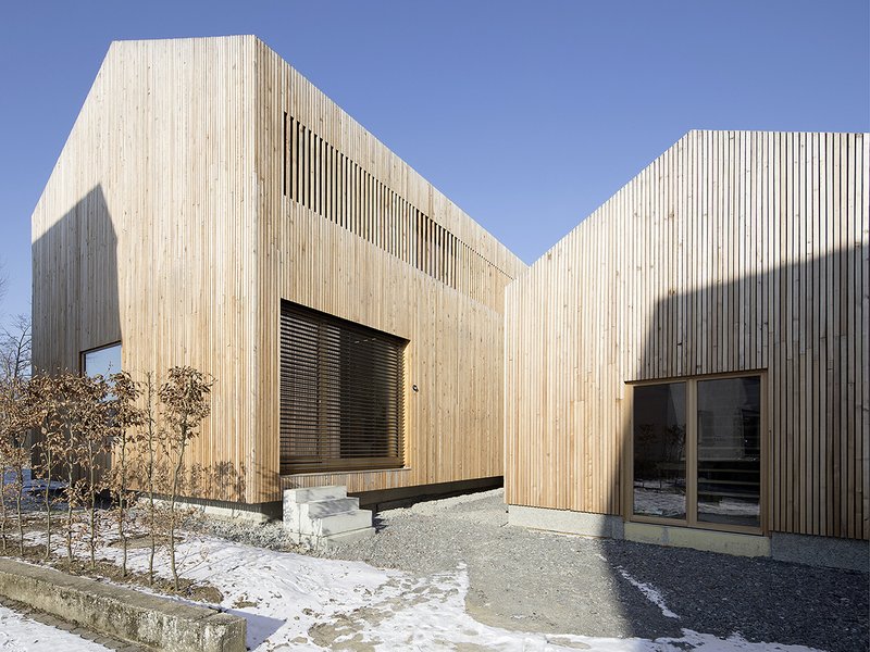 Die Konstruktion ist teilweise gedämmt. Dächer und Außenwände beider Baukörper sind mit einer Verkleidung aus sibirischer Lärche ausgeführt. Um die monolithische Außenwirkung weiter zu unterstützen sind einige Fenster sowie die Lüftungsöffnungen mit Schalung belegt. Fehlende Überstände unterstützen eine einheitliche Vergrauung. Wie die Konstruktion folgt auch die Gebäudetechnik der Idee möglichst konsequenter Nachhaltigkeit. Das Gebäude verfügt über eine Gas-Brennwertheizung und eine kontrollierte Wohnraumlüftung mit Wärmerückgewinnung. Der Ofen im Wohnbereich ist mit einem Wasserspeicher verbunden.