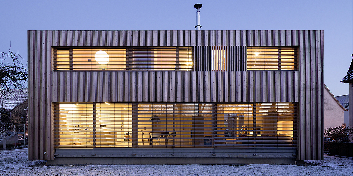 Der Wohnbereich im Erdgeschoss des Hauptgebäudes öffnet sich zum Dorfanger und zu einem kleinen Fluss, der Glems. Von dem Gast- und Arbeitszimmer überblickt man den kleinen Binnenhof im Osten. Über eine einläufige Holztreppe wird das Obergeschoss erschlossen. Hier befinden sich auch ein Sport- und Fernsehzimmer sowie der Technikraum. Das Wohngebäude ist aus hochgedämmten Lignotrend-Wänden- und Brettstapeldecken mit integrierten Schallschutzelementen ausgeführt. Das geneigte Dach besteht aus Vollholzelementen. Das Nebengebäude ist etwas einfacher ausgeführt und besteht aus Holzständerwänden und Holzbalkendecken sowie einem Holzsparrendach.
