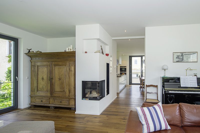 Das in Massivbauweise errichtete Gebäudeensemble erreicht mit einem vorbildlichen Wärmeschutz sowie Holzfenstern mit Dreischeibenverglasung den Effizienzhaus-Standard 55. Die hohe Speichermasse unterstützt dabei den durch Raffstore an allen Fenstern generierten sommerlichen Wärmeschutz. Im Winter wird die so gespeicherte Wärme wieder sukzessive an die Räume abgebenen und führt zu einem hohen Maß an Behaglichkeit. Zusätzlich sorgen eine Gasbrennwerttherme plus Plasma-Solaranlage auf dem höchsten technischen Standard zusammen mit der Fußbodenheizung für wohlige Wärme im ganzen Haus.