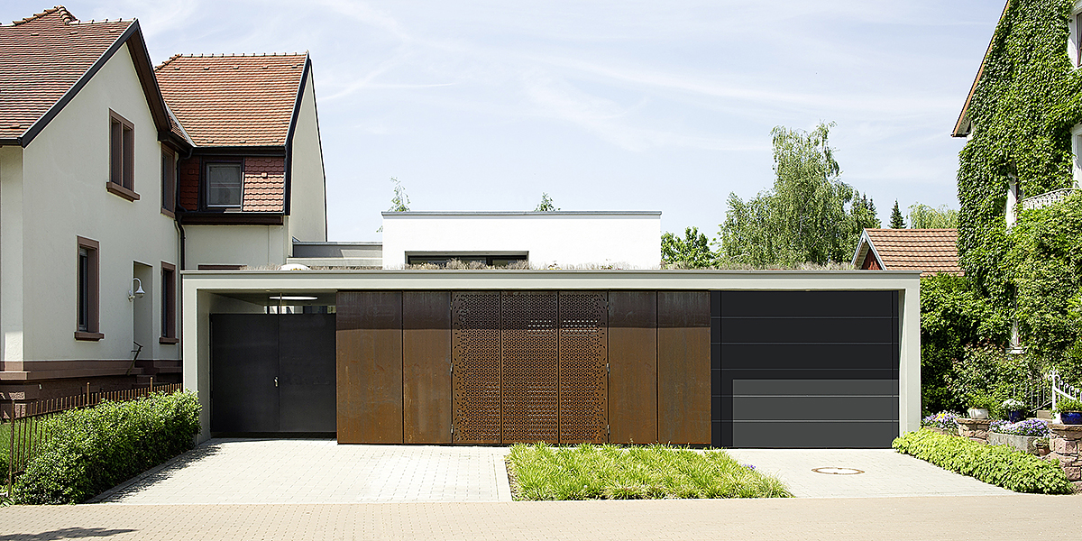 Das vordere Nebengebäude beherbergt unter einem markanten Sichtbetonbügel im Erdgeschoss die Garage und Einliegerwohnung sowie im Untergeschoss Keller -und Technikräume. Der Wohnkubus wird von einer Cortenstahlfassade umschlossen, welche im Aufenthaltsbereich als klappbarer Sonnenschutz gelocht ausgeführt wurde. Durch den vorderen Bügel hindurch gelangt man zum zweigeschossig verglasten Eingangsbereich des Hauptgebäudes. Dieser befindet sich auf dem Halbgeschoss zwischen oberere Wohnebene und unterer Schlafebene. Im Treppenhaus entsteht dadurch Platz für ein geräumiges Bücherregal und eine kleine Lese-/Arbeitsecke. Die Bereiche im Untergeschoss genießen die Ruhe der Gartenebene und den Ausgang ins Grüne, die im Obergeschoss hingegen die Aussicht und geschützte Loggien. Hochwertige Materialien verleihen den jeweiligen Räumen ihren eigenen Charakter. Durch wandintegrierte Schiebetüren können Räume flexibel erweitert oder abgetrennt werden.