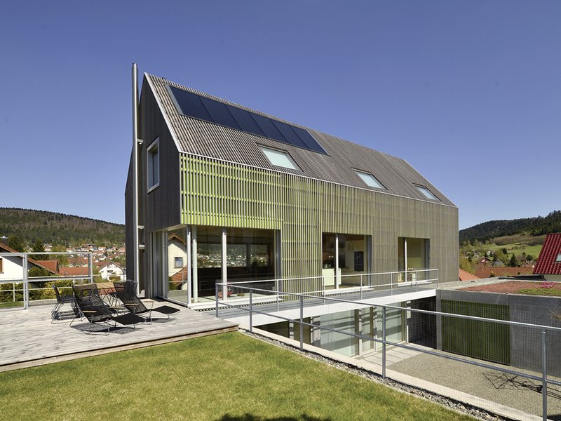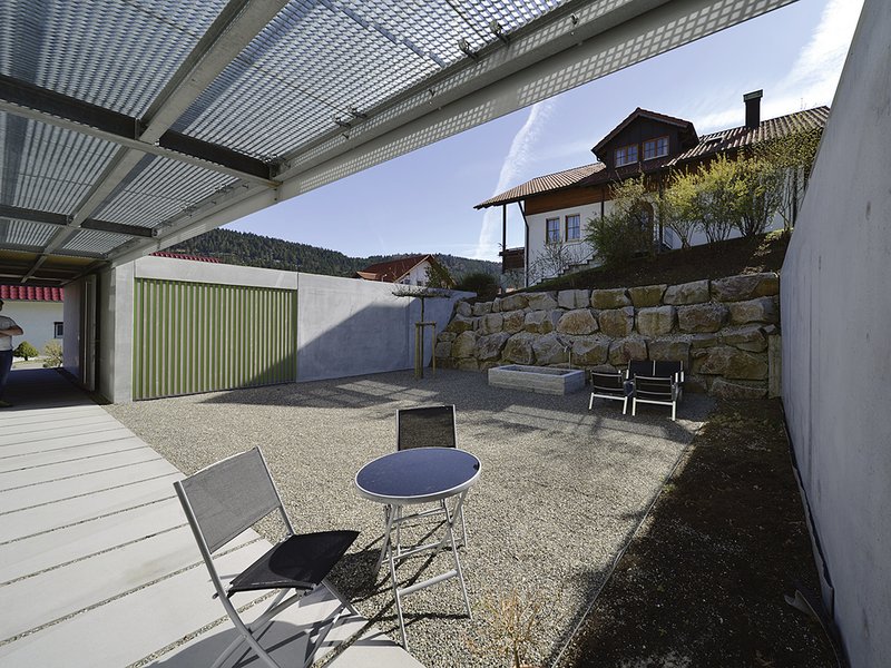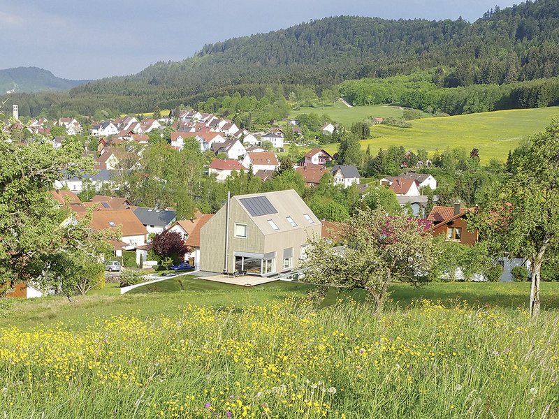 Mit seiner Lage am Ortsrand von Wehingen schafft das Gebäude einen harmonischen Übergang von der strukturierten Bebauung in die offene Landschaft. Die Einbettung des kompakten Baukörpers in die Topografie am Hang und die sorgsam ausgewählten Materialien des Gebäudes mit seinen großflächigen Öffnungen zu den angrenzenden Streuobstwiesen verstärken den Bezug zum Grünen.