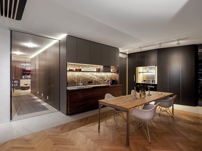 Die Materialisierung orientiert sich an einer authentischen Handhabung mit angeschliffenem Sichtestrich, Terrazzo in den Bädern, eloxiertem Aluminium, Nussbaum- und Hainbuchemassivholz bzw. Furnier an den Wänden, Eichenparkett und schwarzgebeiztem Eichefunier, unbehandeltem Stahl, großformatiger Naturstein bzw. Wandfliesen und rauem Putz als natürlichen Wandhintergrund. Die Lichtführung betont die Architekturkörper und ist mit Lichtszenen programmiert. Die klappbaren Möbel (frei auskragende Betten, Schranktüren und -klappen etc.) wurden individuell entwickelt und betonen die flexible Raumkonzeption.