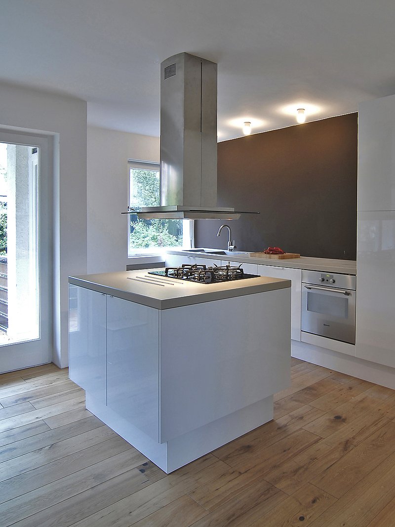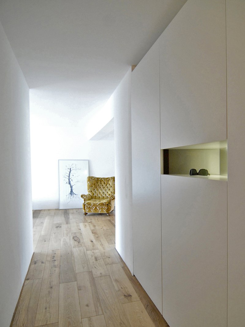 Die kleine Eigentumswohnung in einem gänzlich unspektakulären Wohnblock aus den 1950er Jahren fand über den Ersatz von massiven Wänden durch intelligent geplante schrankartige Raumteiler zu neuer Größe. Pfiffige Details und eine konsequente Materialität (Holzdielenboden und weißer Anstrich von Decken-, Wand- und Schrankflächen) unterstützen den Eindruck von Großzügigkeit und Helligkeit.