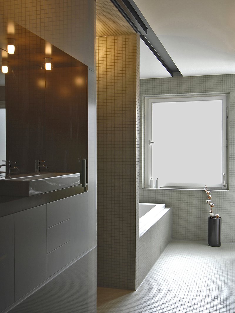 Stuttgarter Westen. Die Grundidee des Umbaus entstand aus dem individuellen Wunsch zweier Gestalter nach einem flexiblen und funktionalen Wohnumfeld. die Voraussetzungen für eine klare Raumkonzeption waren günstig, und so dauerten die Arbeiten zwei Monate. Die Entkernung der Wohnung bis auf die tragenden Teile lässt eine einfache Formensprache erkennen. Der Einbau im Gang beinhaltet die Tür zum Kinderzimmer und verstärkt so die Flucht des Ganges. Auf einen Einbau im Wohnraum wurde verzichtet zugunsten der Kommunikation der beiden einander gegenüberliegenden Balkone. Die Trennung von Toilette, Schlaf- und Wohnraum erfolgt durch eine gezielte Anordnung von Multifunktionalmöbeln. Eine ungewöhnliche Perspektive und Raumtiefe werden geschaffen durch das öffnen und schließen der integrierten Türen in den Schränken. Der konsequente Verzicht auf Griffe unterstreicht die minimalistische Anforderung des Entwurfs. Im Bad sind Toilette, Dusche und Wanne wie in einem Kabinett angeordnet. Eine gemeinsame Schiebetür schließt im Wechsel Toilette und Dusche ab.