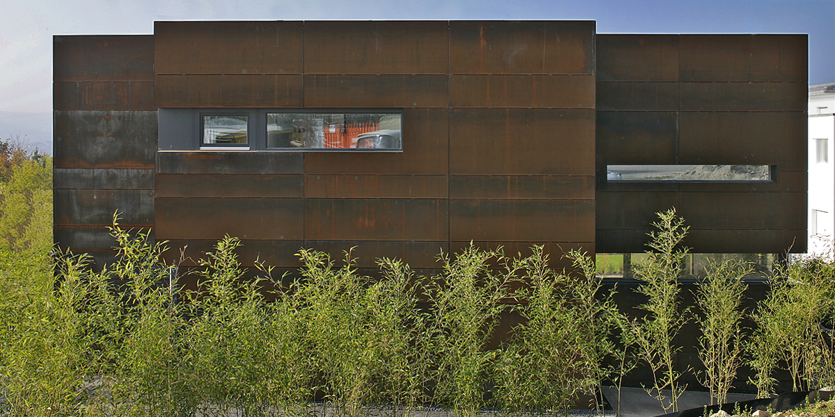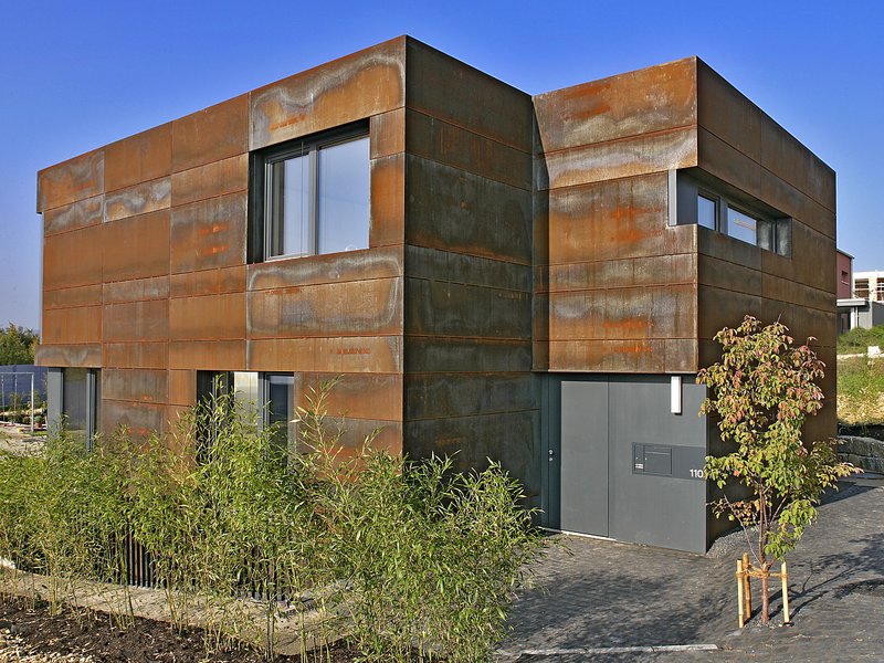 Eine sichtbare Schraub- oder Nietbefestigung wollten wir uns nicht vorstellen. Eine technische Herausforderung war die geklebte Lösung, für die wir uns entschieden haben, schon deshalb weil es dafür mit diesem Material in Verbindung mit der Auskragtiefe der Unterkonstruktion und dem Einzelgewicht der Platten, auch der Rostoberfläche noch keine, zumindest uns bekannte konstruktive Referenz gab. So ist die Aluminium-Edelstahlunterkonstruktion eine Sonderlösung, die wir mit dem beauftragten Fassadenbaubetrieb entwickeln konnten, auch in Abstimmung mit dem Passivhausinstitut, die Gebäudezertifizierung war unumstößliches Ziel.