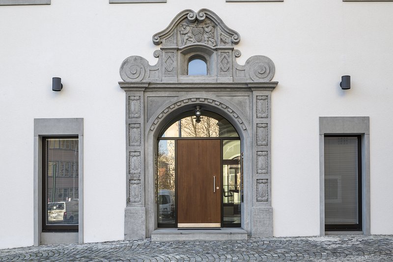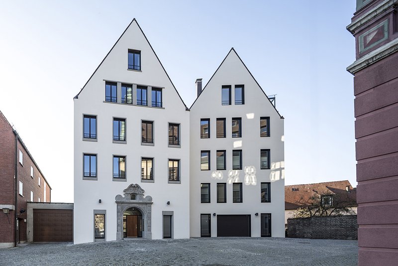 Durch Abbruch des Hauptgebäudes im Osten und Abbruch des vorgelagerten Anbaus eröffneten sich die Möglichkeiten für eine funktionsbegründete Gestaltung. Über die Gewölbe im Erdgeschoss und in den Untergeschossen wurden Lastverteilungsdecken gelegt, da die alte Decke statisch nicht für eine definierte Lastabtragung herangezogen werden konnte. Dadurch wurde einerseits eine zeitgemäße Nutzung und Funktion möglich und andererseits konnten die Raumstrukturen des historischen Erdgeschosses erhalten werden. Die ursprünglichen Geschosshöhen wurden wieder berücksichtigt, sodass die städtebaulichen Maßstäbe und Proportionen wieder hergestellt werden konnten. Um die Struktur der Kellergewölbe nicht zu zerstören, wurde eine Spezialstütze eingeschoben, an der alle Geschosse „hängen“. Die Terrasse auf dem südlichen Anbau bieten im Erdgeschoss die gewünschten Möglichkeiten hinaus zu treten. Im bestehenden Erdgeschoss wurde mit Zustimmung des Denkmalsschutzamtes ein Erschließungsbereich (Lift und Treppenhaus) eingebaut, der die beiden Häuser verbindet. Das westlichere Gebäude wurde, im Gegensatz zu dem ursprünglichen Garagenanbau, mehr zum Schwörhaus hin verschoben und wird damit als Schlusspunkt des Gebäudesaums zum Schwörhaus hin spürbarer.