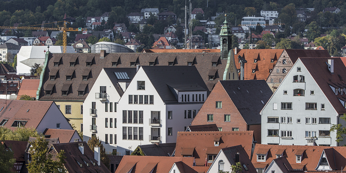 Bauaufgabe war die Wiederherstellung des städtebaulichen Saums, in Anlehnung an den Schlumberger Plan (1808). Die Fassaden zum Platz sind in städtisch strenger Anmutung gegliedert. Es findet eine Differenzierung der Gebäude einerseits durch verschiedene Materialien (Sichtbeton und Stahl) an den Gewänden statt, andererseits gibt es ein gemeinsames „historisches Eingangsportal“. Die zwei Neubauten haben steile, für Ulm typische Dächer und einen knappen Ortgang. Die südliche Lochfassade wird aufgelöst. Sie steht auf einem Vorbau mit Terrassengarten, der sich mit seiner Ziegelstruktur den Sockelzonen der Stadtmauer anschließt und zur Staufermauer nach Osten überleitet.