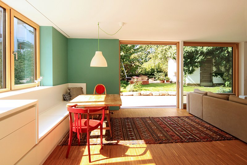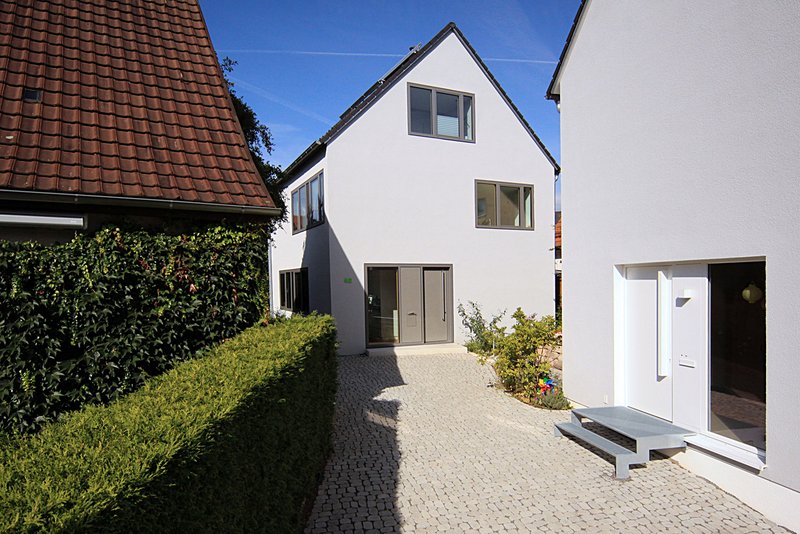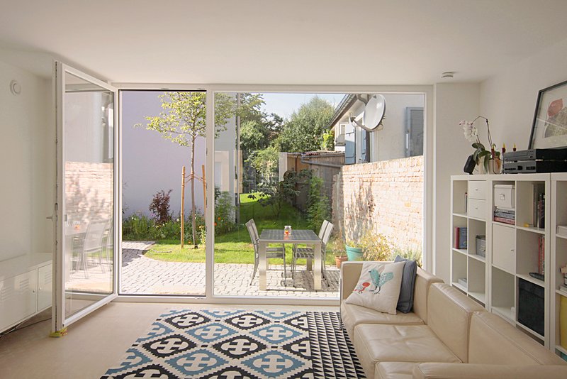 Kubatur und Typus der Neubauten greifen den Bestand auf. Das Hinterhaus wurde von den Grenzen und vom Vorderhaus etwas weiter abgerückt. Dadurch konnten auf kleiner Fläche qualitätvolle Außenräume geschaffen werden, diese bilden sozusagen Freiluft-Wohnräume. Sichtachsen über die gesamte Tiefe des Grundstücks verleihen der räumlichen Dichte Auflockerung und Weite. Die großzügige Einfahrt bietet gemeinsame Spielfläche für die Kinder und präsentiert den Charme der angrenzenden Giebelwand des Nachbargebäudes.