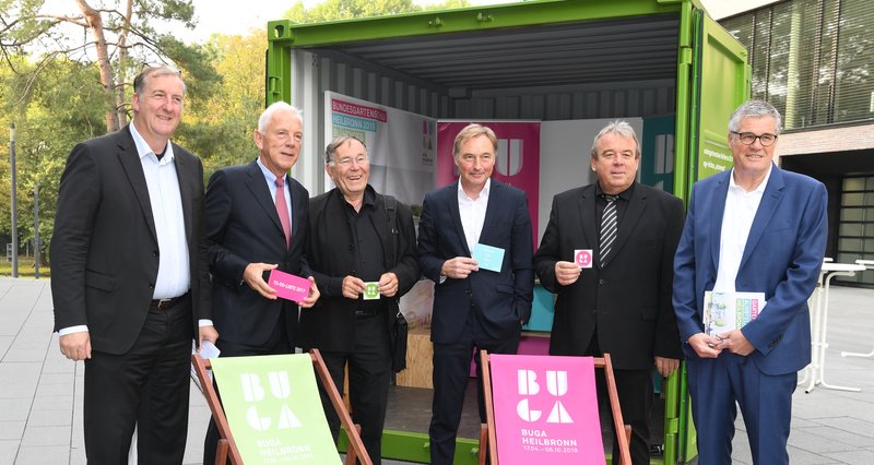 v.l.: Präsident AKBW Markus Müller, Oberbürgermeister Harry Mergel, Architekt und Stadtplaner Prof. Dr. Jan Gehl, Vorstandsvorsitzender Bundesstiftung Baukultur Reiner Nagel, Baubürgermeister Wilfried Hajek, Geschäftsführer Buga 2019 Hanspeter Faas