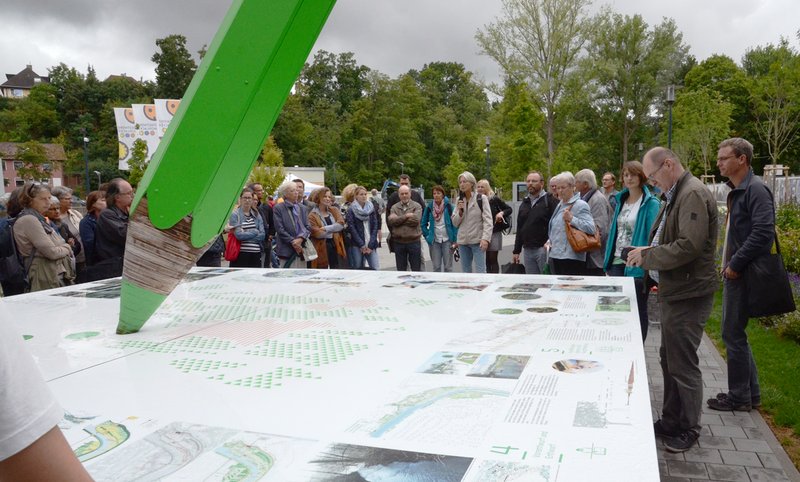 Um die Wirkung von Landschaftsarchitektur unmittelbar zu erfahren, und einen Eindruck der mannigfaltigen Aufgaben zu bekommen, konnten sich die Besucher anschließend einer Führung über das Gartenschaugelände anschließen. Elke Ukas, die als Landschaftsarchitektin maßgeblich für die Umsetzung des Projekts verantwortlich war, führte am renaturierten Enzufer entlang. Die weitläufigen Freianlagen auf den neu angelegten Hochufern laden zum Verweilen ein und die offene Gestaltung der Grünflächen sowie die entstandenen Blickbeziehungen erzeugen wohltuende Aufenthaltsqualitäten. Auch die Sonne zeigte sich zum Ende des Rundgangs noch und der Nachmittag in Mühlacker wurde abgerundet, indem sich die Gartenschau von ihrer schönsten Seite zeigte und somit bei allen Besuchern den erwünschten bleibenden Eindruck hinterließ.