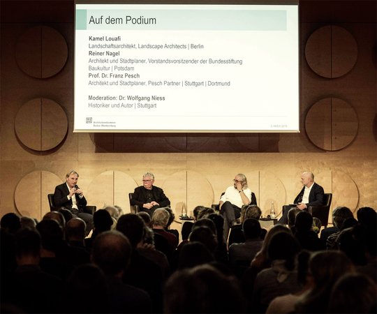 Das Interesse am Landschaftsarchitektur-Quartett ist seit Jahren erfreulich groß, sodass die elfte Auflage des Formats in diesem Jahr in den Hospitalhof in Stuttgart verlegt wurde. Daher war es umso erfreulicher, dass am Abend des 21. Oktober mehr als 350 Interessierte anwesend waren. Thema der Veranstaltung war die Landschaftsarchitektur im Zusammenhang mit der IBA'27. Dazu diskutierte eine exzellente Runde aus Kamel Louafi (Landschaftsarchitekt), Reiner Nagel (Architekt und Stadtplaner) und Dr. Franz Pesch (Architekt und Stadtplaner) mit dem Moderator Dr. Wolfgang Nies (Autor und Historiker) die Facetten des Themenfelds. Tagsüber tourte die Gruppe durch die Stadt und die Region, um von markanten Aussichtspunkten einen ersten Überblick über das Projektgebiet zu gewinnen.