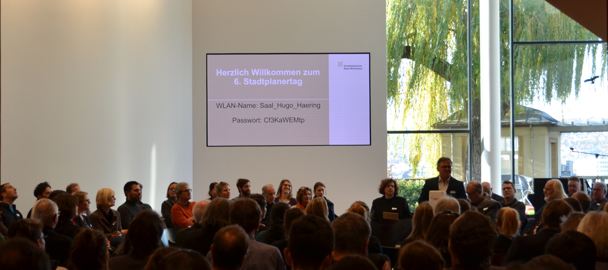 Anlässlich des Jubiläums 25 Jahre Stadtplanung in der Architektenkammer Baden-Württemberg widmete sich der 6. Stadtplanertag am 14. November dem Berufsstand selbst: mit einem historischen Blick zurück auf die Anfänge, einem kritischen auf die Gegenwart und einem spannungsvollen in die Zukunft. Eine partizipative Sitzordnung in konzentrischen Kreisen, ein Wurfmikrofon und ein digitales Abstimmungstool schufen die Grundlage für einen lebendigen, interaktiven Austausch zwischen den Akteuren der Tischrunden und den über hundert Teilnehmenden.