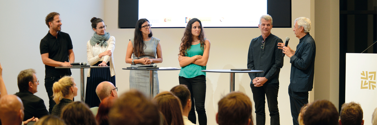 Nach dem spannenden Vortrag folgte die Podiumsdiskussion. Hieran beteiligt waren auf Seiten der Arbeitgeber Professor Enrique Sobejano, Professor Stephan Birk und Alexander Vohl sowie auf Seiten der Arbeitnehmerinnen Dr. Elena Gutiérrez (Spanien) und Alejandra Padilla-González (Mexico). Es war ein reger Austausch von Erfahrungen und Ideen.