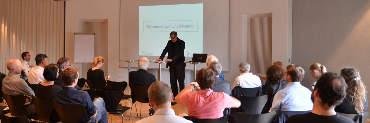 Intensiv und vielfältig war die Diskussion am 28. Juni im Haus der Architekten in Stuttgart. Rund 40 Expertinnen und Expertenaus Architektur- und Ingenieurwesen folgten der Einladung der Architektenkammer Baden-Württemberg (AKBW) und der Deutschen Gesellschaft für Nachhaltiges Bauen (DGNB) zum EnEV-Hearing, um der Politik wichtige Anregungen zur Umstrukturierung der Energiegesetzgebung mit auf den Weg zugeben. Die Bundesregierung plant, mit Beginn des Jahres 2017 das Energieeinsparungsgesetz (EnEG) und die Energieeinsparverordnung (EnEV) mit dem Erneuerbare-Energien-Wärmegesetz (EEWärmeG) zusammenzulegen, um die EU-Gebäudeenergieeffizienzrichtlinie zu erfüllen.