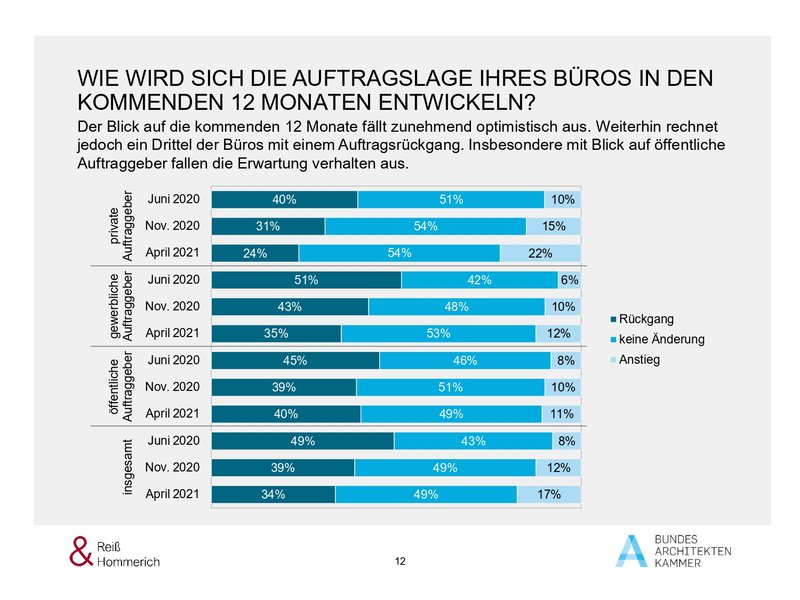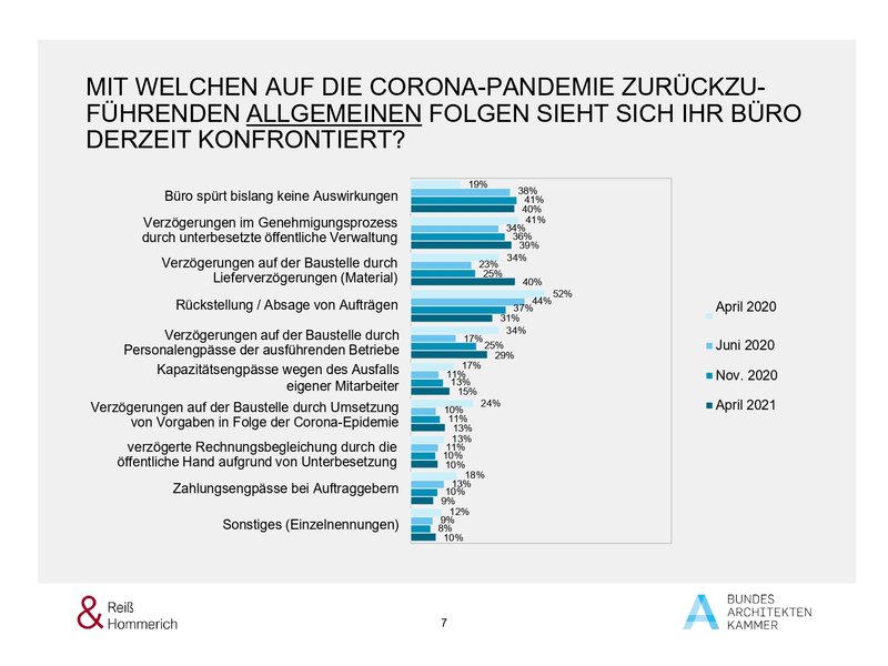 Die mittlerweile vierte Befragung zu den Auswirkungen der Corona-Pandemie zeigt vor allen Dingen: Während der Anteil der Büros, die sich mit Auftragsrückstellungen bzw. -absagen konfrontiert sehen, seit Beginn der Befragungen zu den Folgen der Corona-Pandemie kontinuierlich sinkt, ist seit Juni 2020 ein Anstieg der Büros festzustellen, die mit Personalausfällen auf der Baustelle oder im eigenen Büro zu kämpfen haben. Im Vergleich zum November 2020 sprunghaft angestiegen ist der Anteil der Büros, die über Lieferverzögerungen auf der Baustelle klagen.
