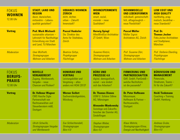Jeweils fünf parallel laufende Seminare zeigten unter dem FOKUS WOHNEN Modelle und Strategien für zukunftsfähigen Wohnraum, bzw. notwendige Ressourcen und Kompetenzen für den Büroalltag unter dem FOKUS BERUFSPRAXIS.