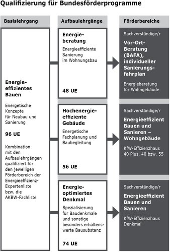 An die Weiterbildungen für die Förderprogramme Energieeffizient Bauen und Energieeffizient Sanieren der Kreditanstalt für Wiederaufbau (KfW) sowie Energieberatung für Wohngebäude (Vor-Ort-Beratung, individueller Sanierungsfahrplan) des Bundesamtes für Wirtschaft und Ausfuhrkontrolle (BAFA) werden unterschiedliche Anforderungen gestellt. Ebenso verhält es sich mit der Fachliste Energieeffizienz der Architektenkammer Baden Württemberg (AKBW) bzw. der Energieeffizienz-Expertenliste für Förderprogramme des Bundes der Deutschen Energieagentur (dena).