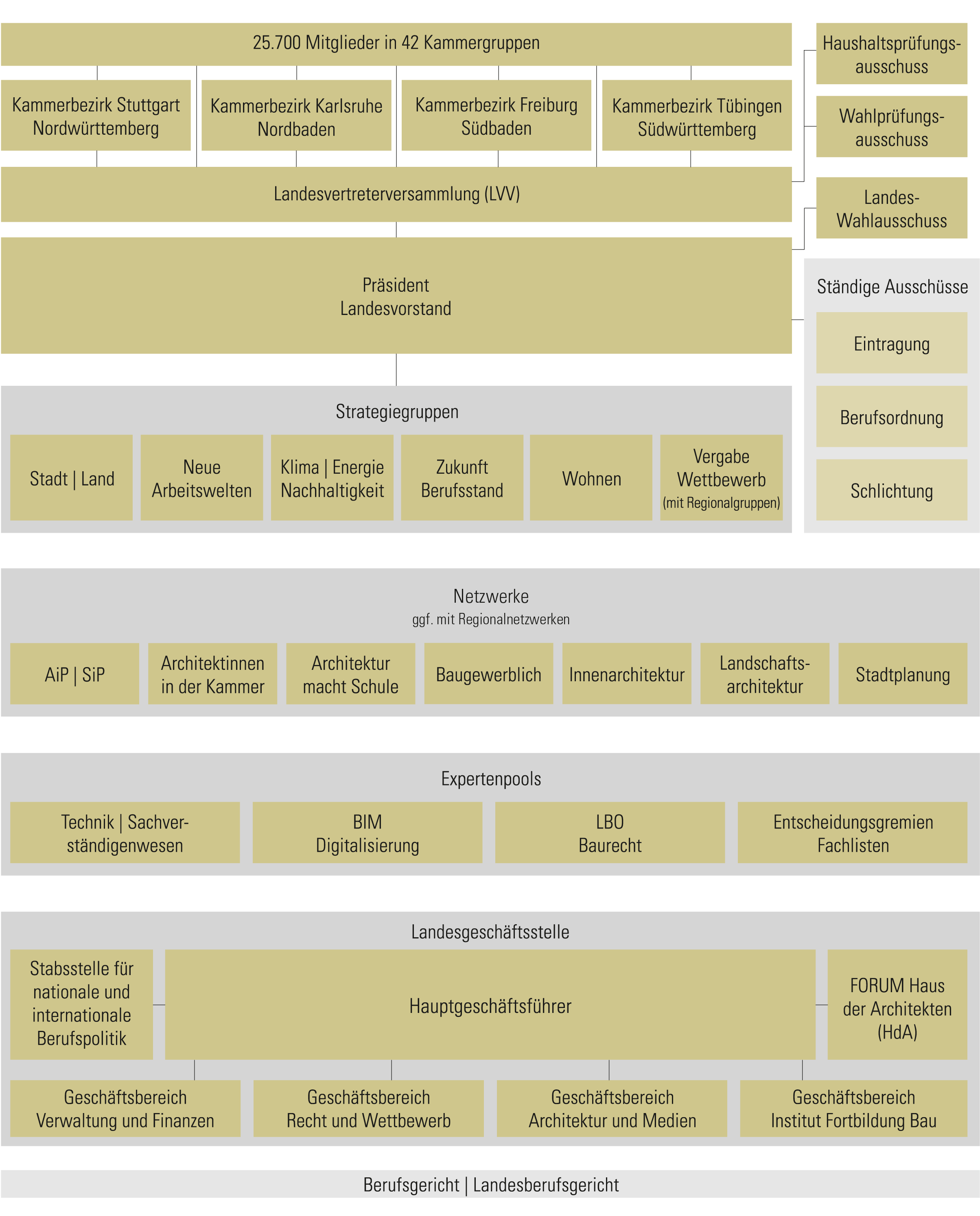 Die Architektenkammer Baden-Württemberg ist Serviceunternehmen, Interessenvertretung und Kontrollinstanz für ihre rund 25.700 Mitglieder aus den Bereichen Hochbau, Innenarchitektur, Landschaftsarchitektur sowie Stadtplanung. Sie ist Ort der Selbstverwaltung: Über demokratisch gewählte Gremien gibt sich die Architektenschaft eine eigene Berufsordnung, bestimmt die Berufspolitik und wirkt bei Gesetzen und Verordnungen mit. Aufgrund ihrer konkreten Erfahrungen aus dem Berufsalltag können die Architektinnen und Architekten in den Gremien zeitnah auf besondere Entwicklungen reagieren.