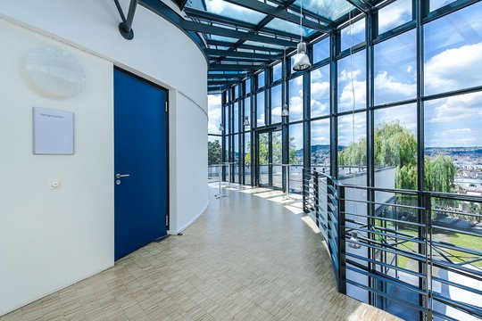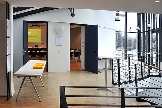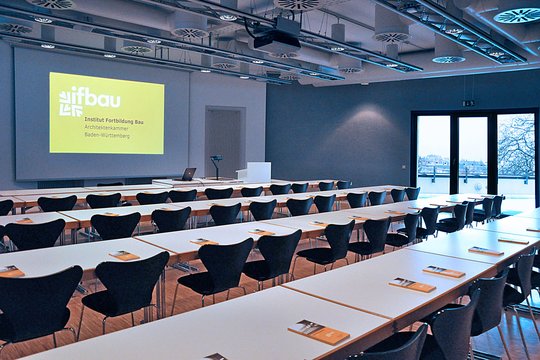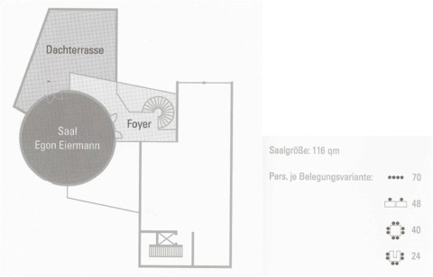 Der Saal Egon Eiermann eignet sich hervorragend für Vorträge und Seminare mit bis zu 70 Personen. Bei Bedarf kann moderne Konferenz-, Video- und Audiotechnik zur Verfügung gestellt werden. Das angrenzende Foyer und die Dachterrasse bilden einen idealen Rahmen für Verköstigungen und Pausengespräche.