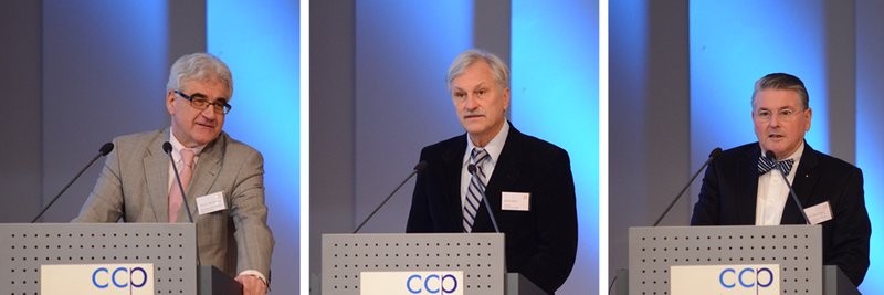 Weitere Grußworte sprachen (v.l.) Professor Dr. Willi Weiblen, Vertreter des Aufsichtsministeriums der Architektenkammer BW, Rainer Wulle, Präsident der Ingenieurkammer BW, sowie Jens Mayer-Eming, Verwaltungsratsvorsitzender des Versorgungswerks