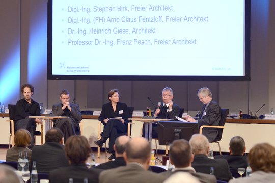 "Meine positive Einstellung zu den Architekten hat sich durch den Wechsel in die Regierung nicht geändert", so Claus Schmiedel, Vorsitzender der Fraktion der SPD im Landtag von Baden-Württemberg. Wichtig sei für ihn eine Politik des Miteinandersprechens und des Gehörtwerdens. Die Großrichtung Nachhaltigkeit beschrieb Schmiedel mit "ökologisch sinnvoll, ökonomisch vernünftig und sozial verantwortbar" und prangerte an, dass beispielsweise in der Öko-Stadt Freiburg größere Aufmerksamkeit darauf gelegt würde, ein Energie-Plus-Haus als Solitär zu sanieren, statt eine ganze Mustersiedlung entstehen zu lassen. "Mich wundert, wenn Bauplätze einzeln vergeben werden und keine abgestimmte Planung stattfindet. Wir sollten eine Baukultur entwickeln, die Nachbarschaft mit berücksichtigt." PPP-Projekten erteilte er eine klare Absage mit dem Hinweis, dass es sich langfristig auf jeden Fall rechne, die Rolle des Bauherrn selbst zu übernehmen.