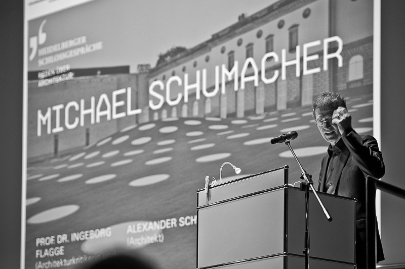 Inzwischen ist es fast schon eine liebe Tradition: Zwei mal jährlich finden im Königssaal des Heidelberger Schlosses die sogenannten Schlossgespräche „Reden über Architektur“ statt. Sowohl Mitveranstalter Bernd Müller, Vermögen und Bau Baden-Württemberg, als auch der erste Bürgermeister Bernd Stadel wiesen in ihren Begrüßungen darauf hin, dass sich zwischenzeitlich in Heidelberg eine der bundesweit wichtigsten Veranstaltungen zur Architekturrezension etabliert hat – und dies mit bemerkenswertem Erfolg wie die mehr als 500 Besucher an diesem Abend bewiesen. Gastredner am 09.04.2013 war Michael Schumacher vom Büro schneider und schumacher aus Frankfurt, ein „architektonischer Schlankmacher“ wie Moderator Reinhard Hübsch vom SWR einleitend bemerkte; Projekte wie das Städel oder auch das Cervantes Institut seien im Umgang mit den architektonischen Mitteln ausgesprochen kalorienbewusst.
