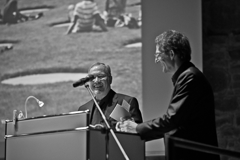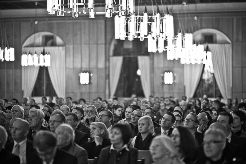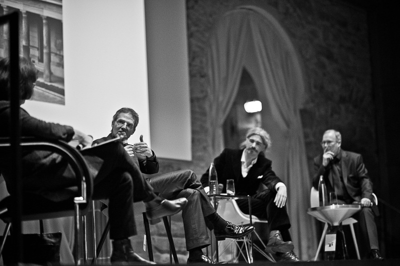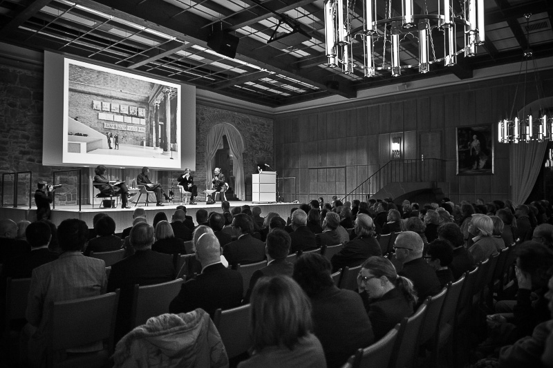 Nach langem Applaus leitet Reinhard Hübsch die Diskussion mit der Vorstellung der Podiumsteilnehmer ein: Ingeborg Flagge, die große Dame der Architektur und Baukultur und Alexander Schwarz, Leiter des Berliner Büros von David Chipperfield und unter anderem Entwurfsarchitekt des Neuen Museums in Berlin.