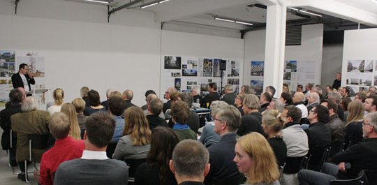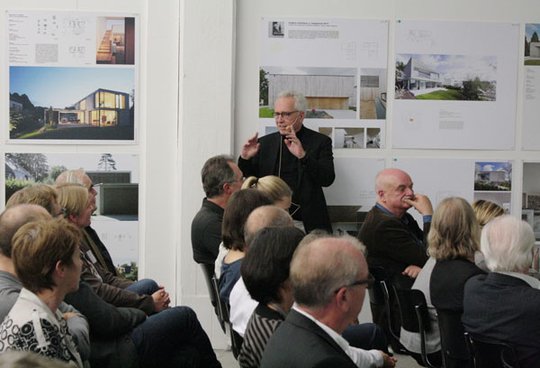 Gastredner Professor Dietmar Eberle hob im Folgenden auf die funktionale Offenheit als Grundbedingung nachhaltiger Architektur ab. „Die einem Gebäude zugedachte Funktion ist im Durchschnitt schon nach zwanzig Jahren nicht mehr aktuell, die Gebäudetechnik veraltet noch wesentlich früher“, erklärte Eberle. Am Beispiel des von seinem Architekturbüro geplanten Gebäudes „2226“ erläuterte Eberle, wie mit einfachen gestalterischen Mitteln und Einsatz modernster Technologien nachhaltige Architektur realisiert werde könne.